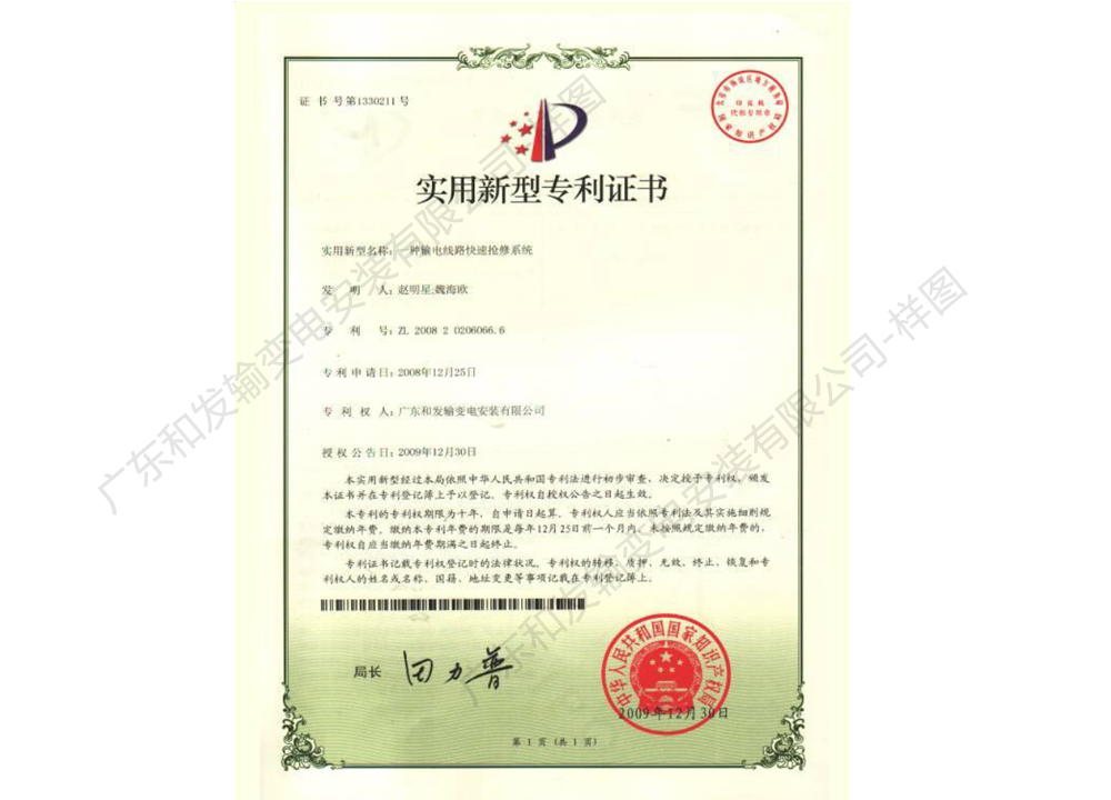 ERS電力緊急搶修系統(tǒng)專(zhuān)利證書(shū)
